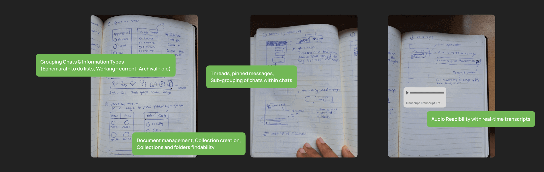 We explored automatically transcribing audio messages into text. We also discussed a feature allowing users to label audio messages manually for easy reference, and enabling a search function specifically for audio messages that go through transcripts of messages.