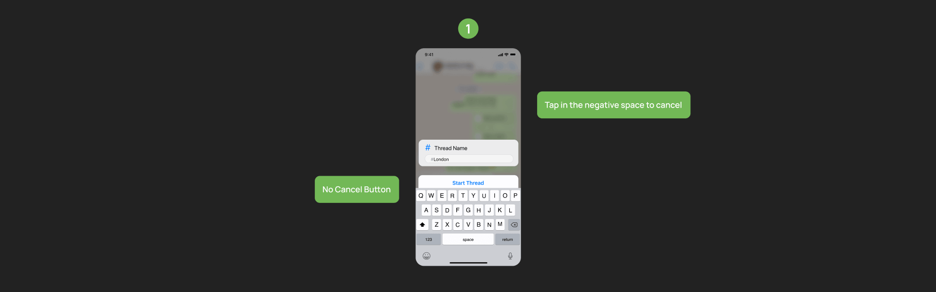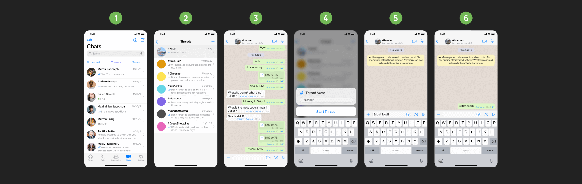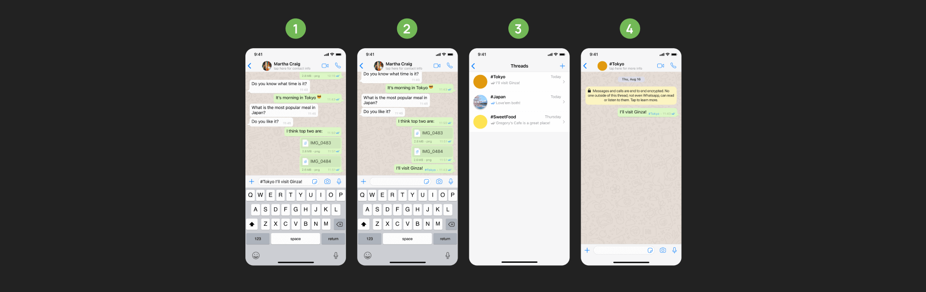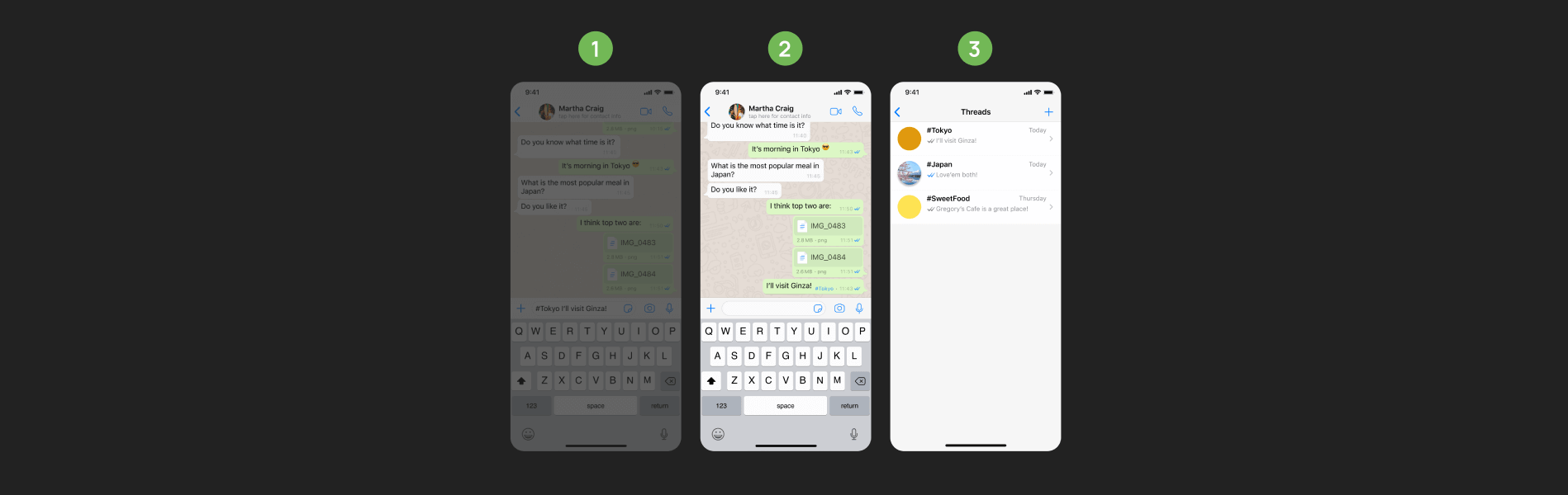 The user initiates a thread by typing “#” followed by the desired name, such as “#Tokyo”, which then appears as a new chat bubble in the conversation.