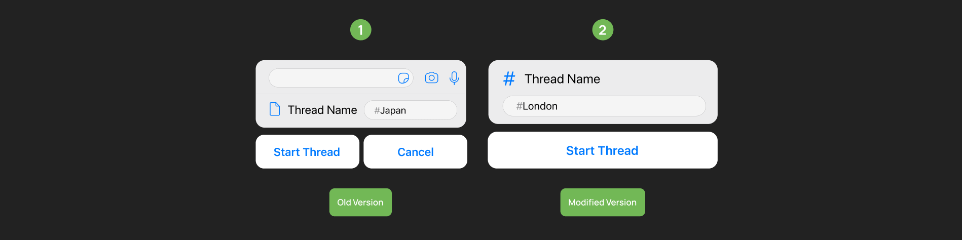 Modification 2: We simplified the design, going from two text fields and buttons to just one of each. The new design on the right streamlines the process for starting a thread and posting a message.