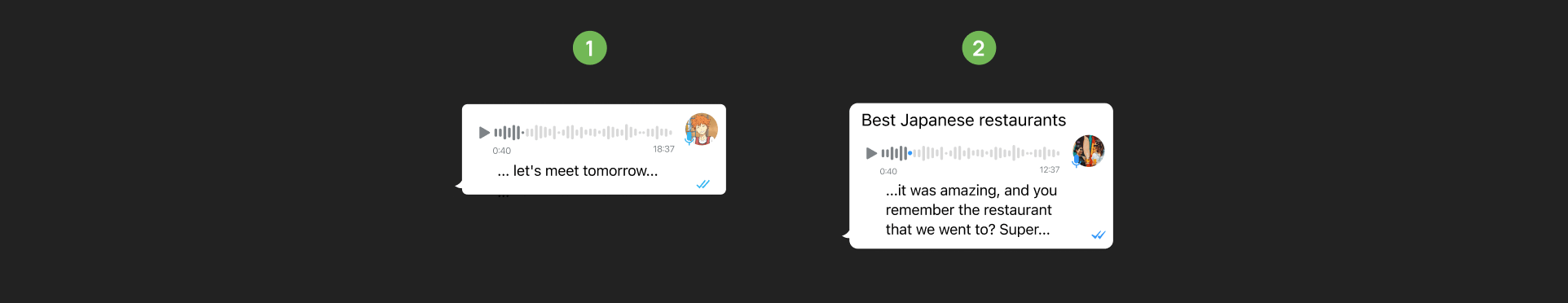 We propose using AI to transcribe audio messages into text. When an audio is played, the first few words of the transcript will appear, much like subtitles in a movie. The AI will also auto-generate a title that can be edited later. Users can search for these transcripts and titles to easily find messages.