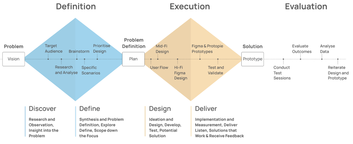 We used the Double Diamond model to guide our design process through four key stages of Discover, Define, Develop, and Deliver to ensure user-centred solutions.