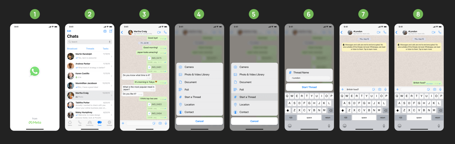 From the home screen, the user taps the Threads link in the middle, which displays a list of threads. The user selects the “#Japan” thread to open it. To create a new thread, the user clicks on the plus icon in the top right as shown above, similar to the plus icon that’s seen on the bottom left in the previous User Flow 1.