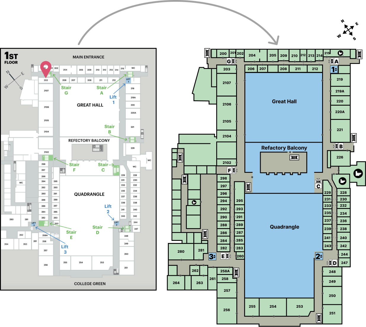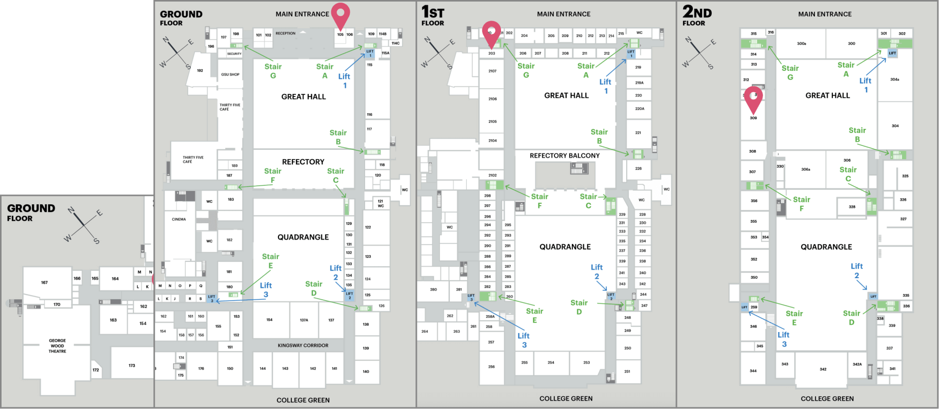 Additionally, there is difficulty in identifying key halls quickly due to a lack of contrasting colours, hindering at-a-glance recognition.