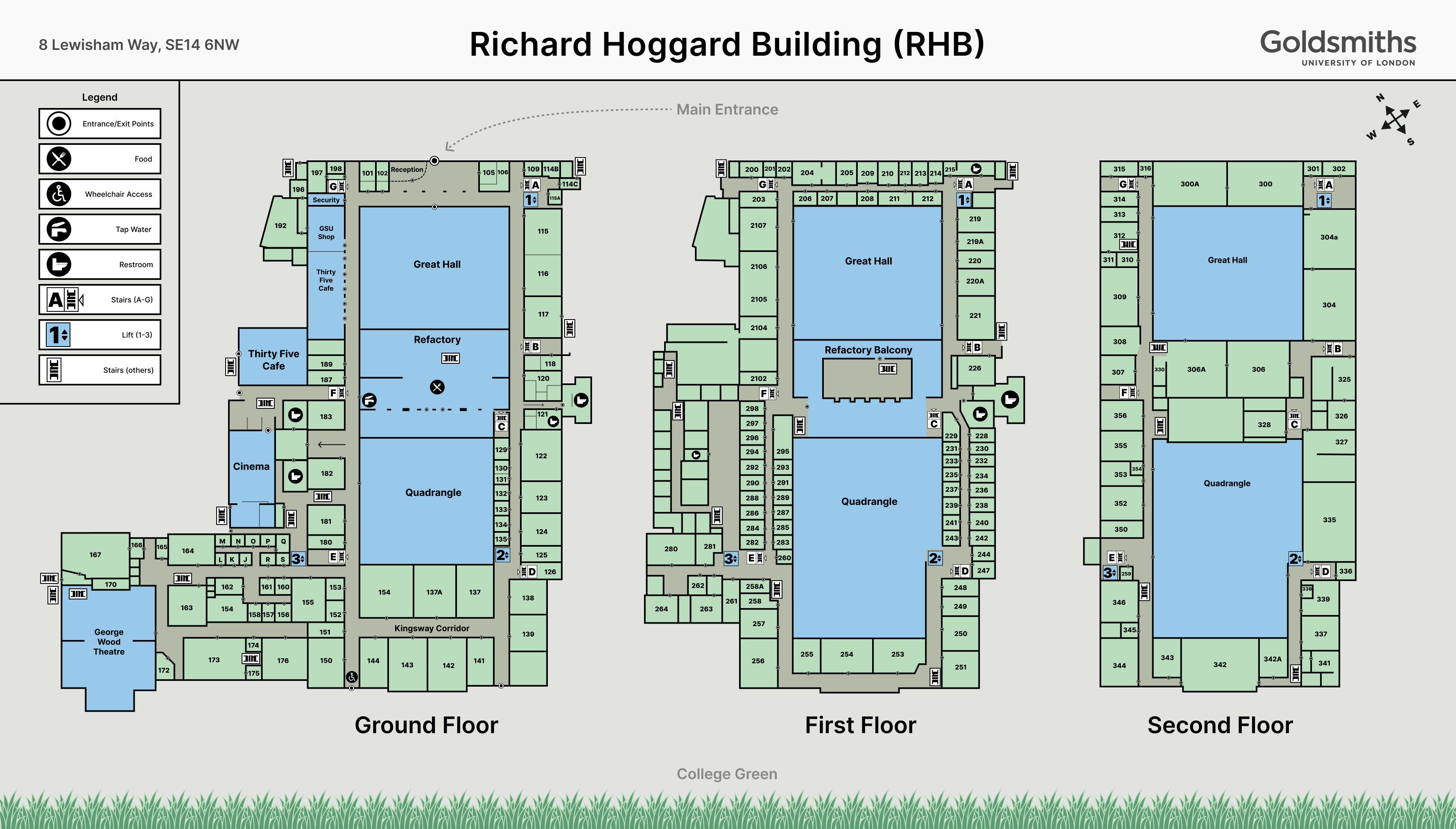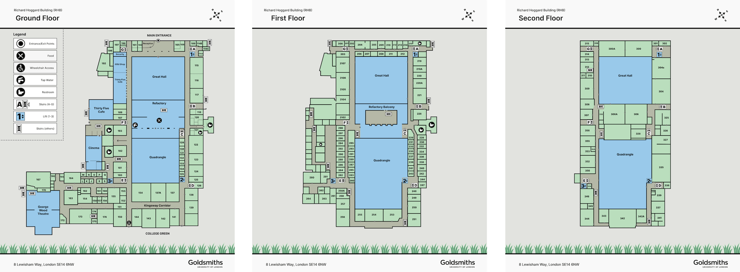 As a part of the programme at Goldsmiths, I was tasked to design a user-friendly, printed map of RHB, aiding new students in locating their classrooms by representing all floors of the RHB on a single page, ensuring the map’s practicality and ease of use.