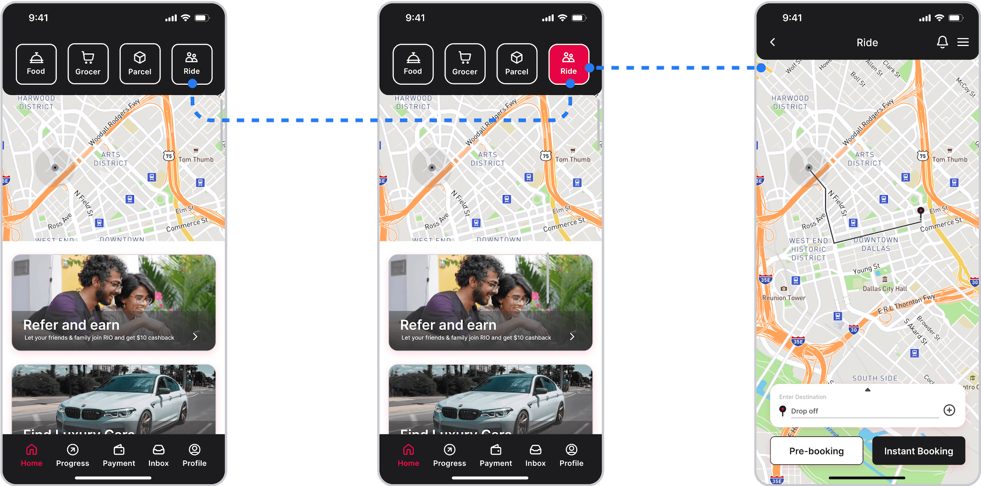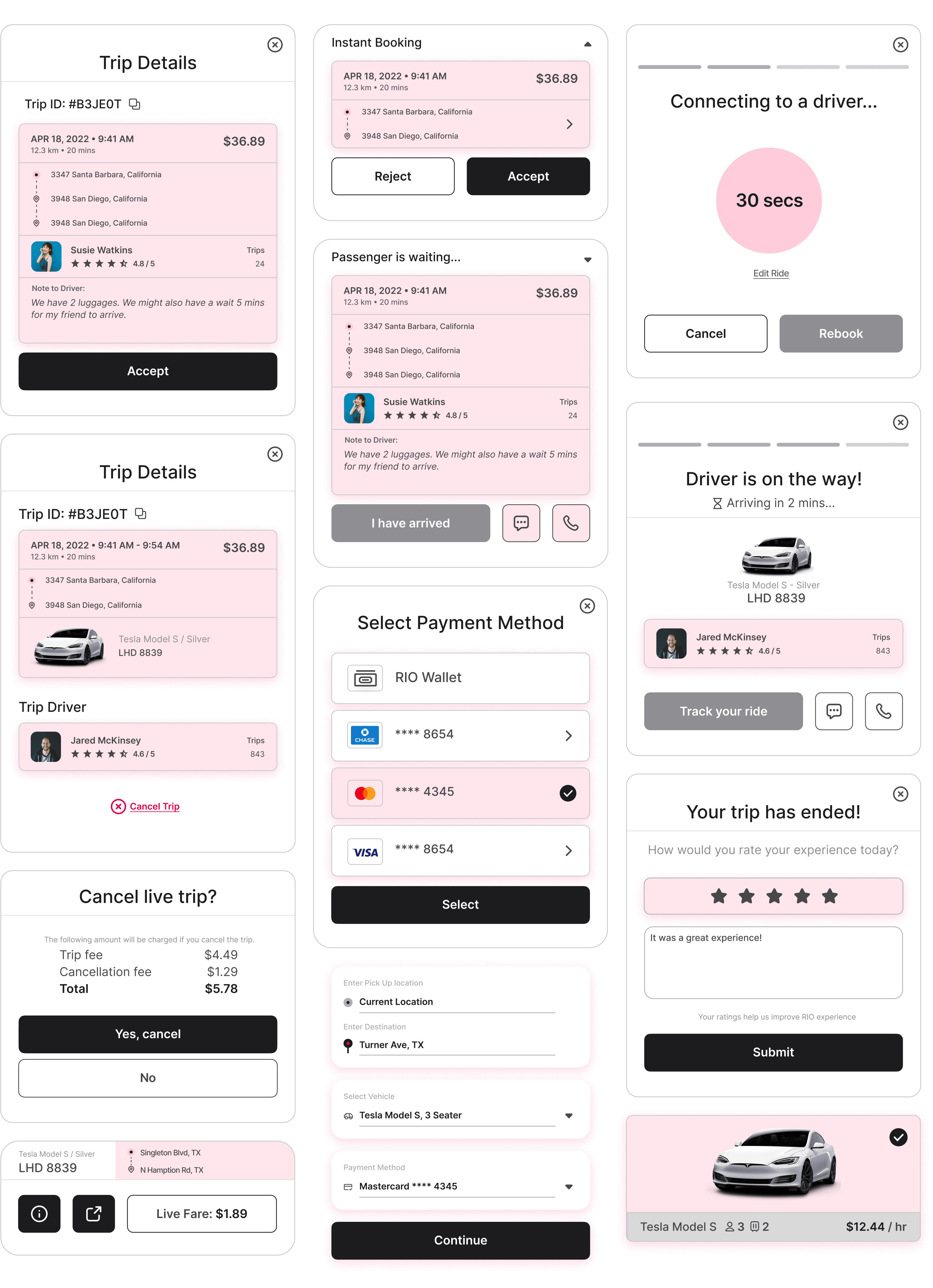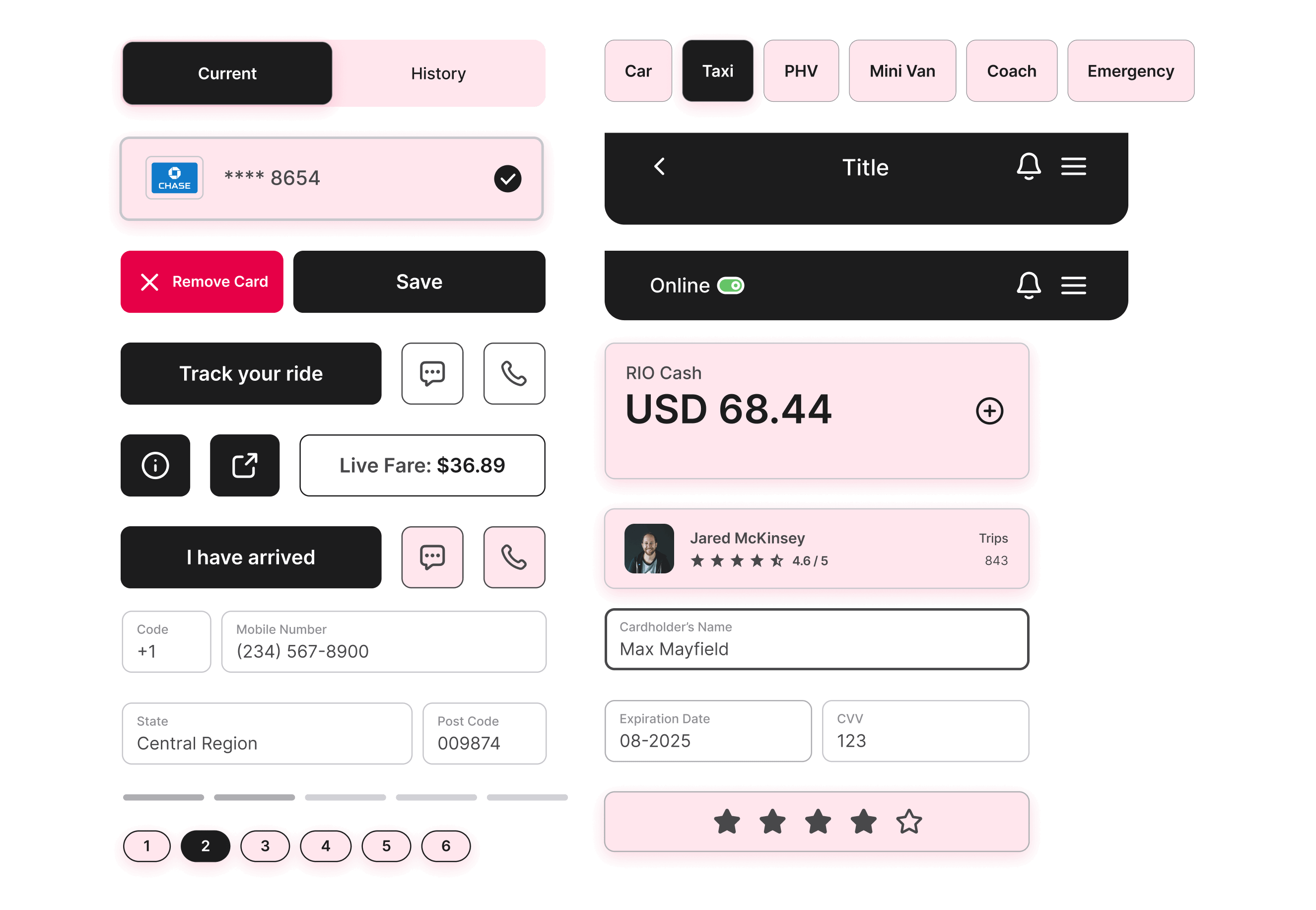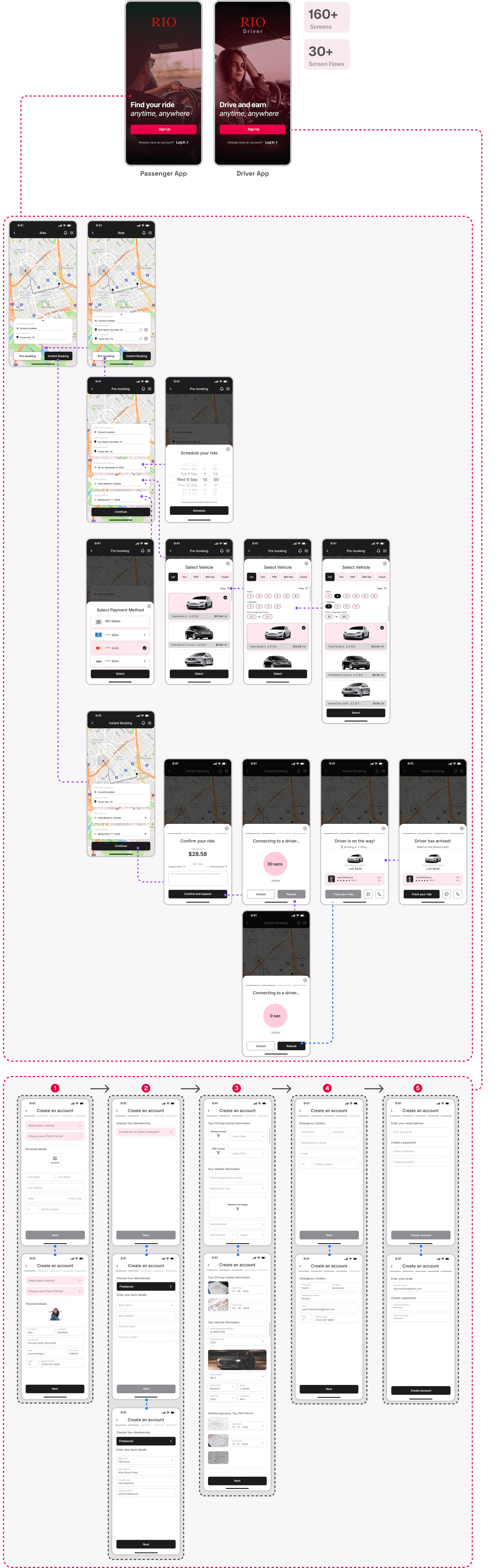 160+ Screens and 30+ Screen Flows for the ridesharing platform, one of the 5 core services of the RIO app.